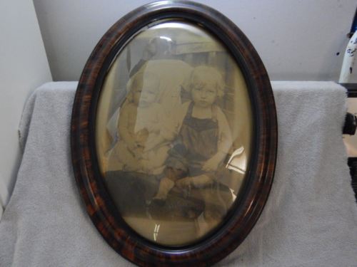 ANTIQUE OVAL FRAME TIGER WOOD VANEER WITH CONVEX / BUBBLE GLASS children