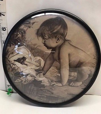 Title (ebay affiliate link): Vintage Convex BUBBLE Round Glass frame wall picture Sepai Girl child frog METAL