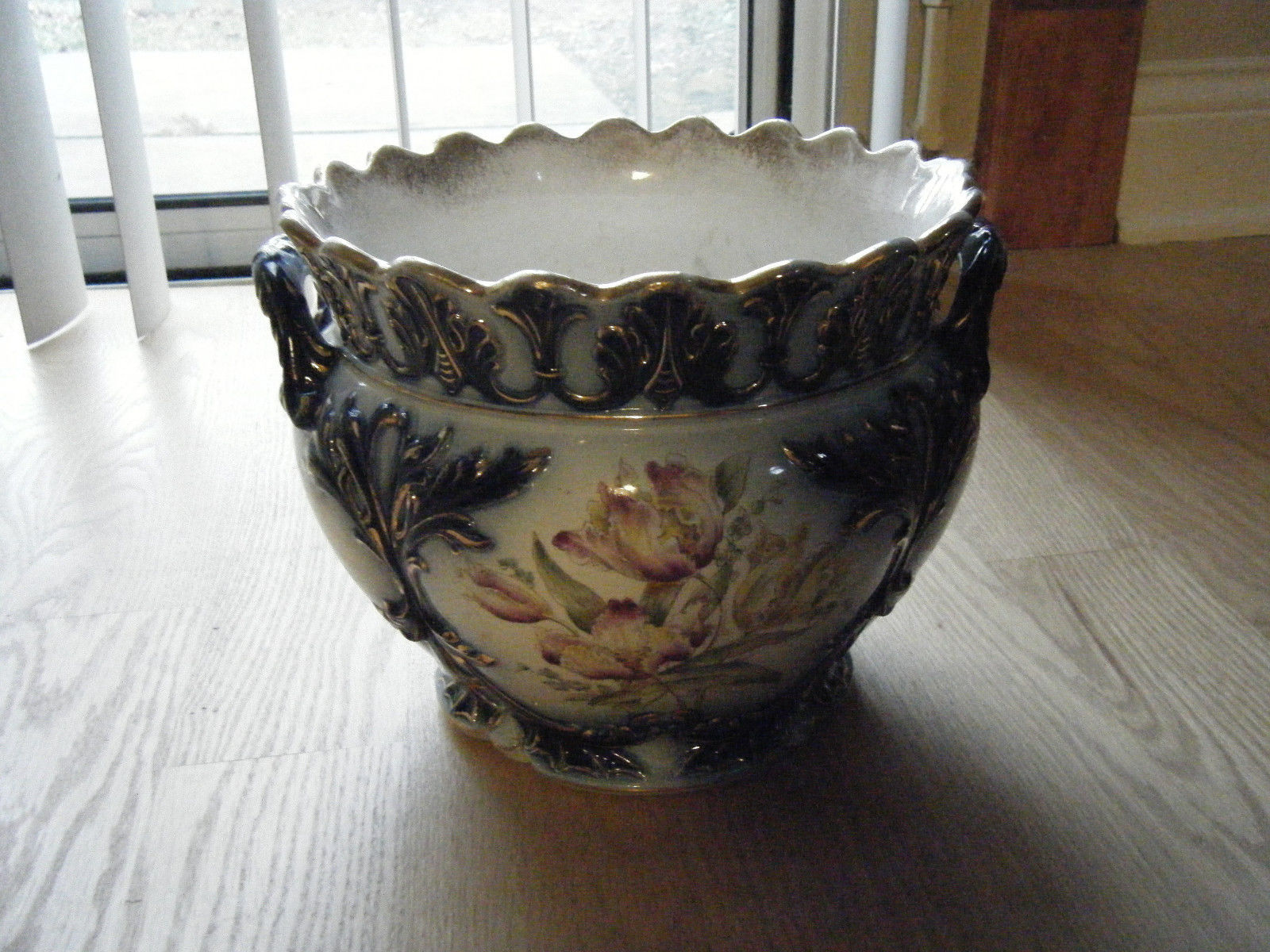 Title (ebay affiliate link): Vtg Flow Blue & White Pottery Jardinaire Planter Floral Gilt Handles, Old Piece