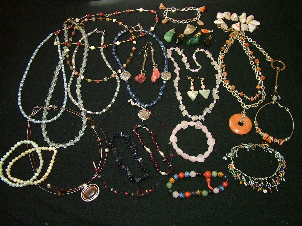 Title (ebay affiliate link): Vintage Glass Stone Gem Necklace Bracelet Key Chain Pendant Earrings Jewelry Lot