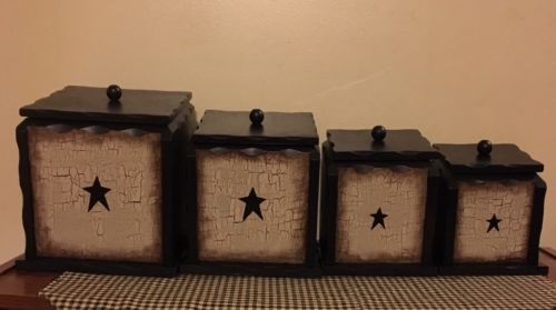 Title (ebay affiliate link): PRIMITIVE CRACKLE CANISTER SET WOOD BLACK AND TAN COUNTRY FARMHOUSE DECOR