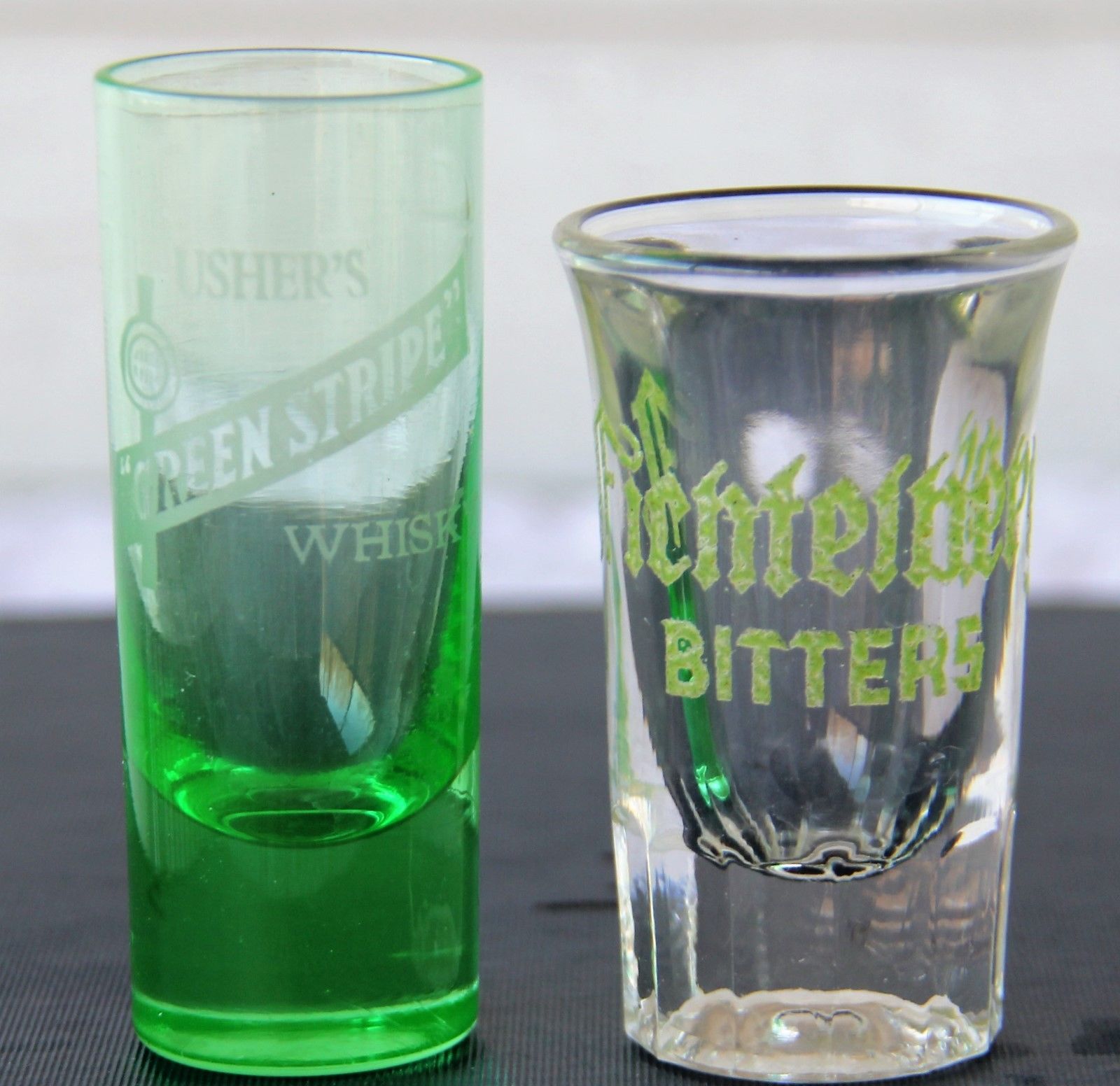 Title (ebay affiliate link): 4 Antique Advertising Bitters Dose Shot Medicine Glasses Usher''s Green Stripe +