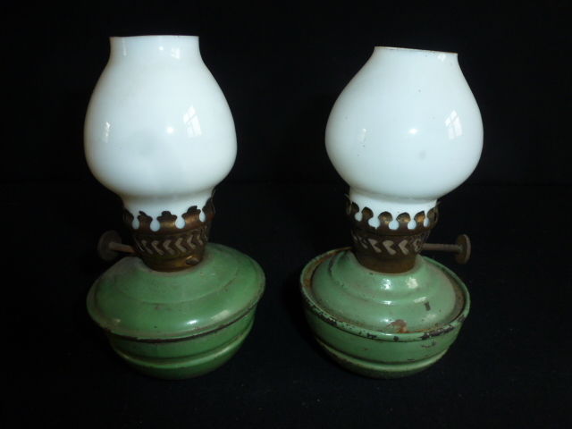 Title (ebay affiliate link): Pair Of Old Miniature Metal Weighted Base Vintage Oil Lamps