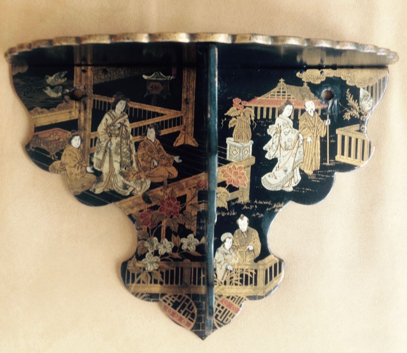 Title (ebay affiliate link): Pair Antique Oriental Lacquered Paper-Mache Folding Shelves