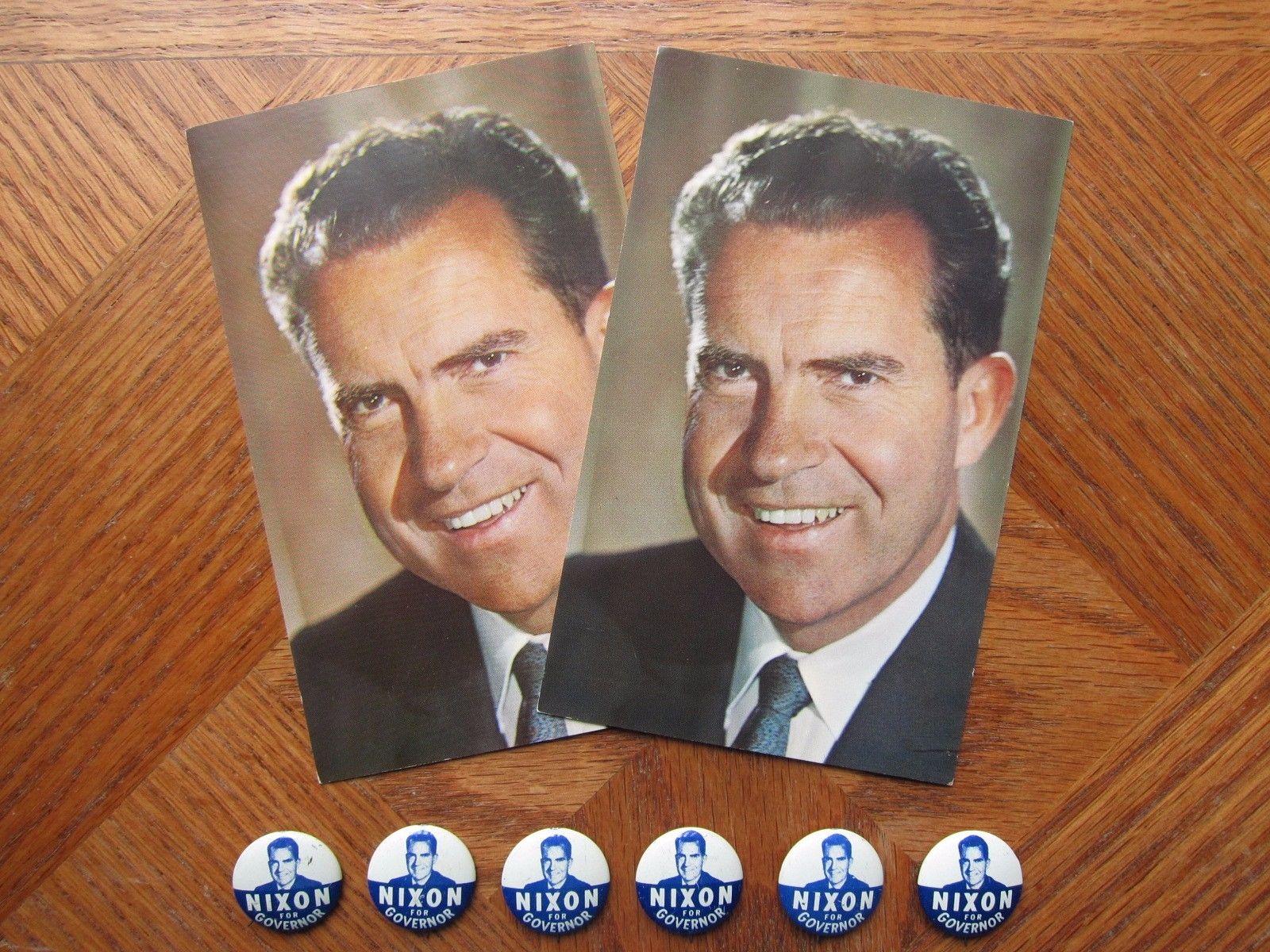 Title (ebay affiliate link): 1962 Richard Nixon for Governor California Political Campaign Pins and Post Card