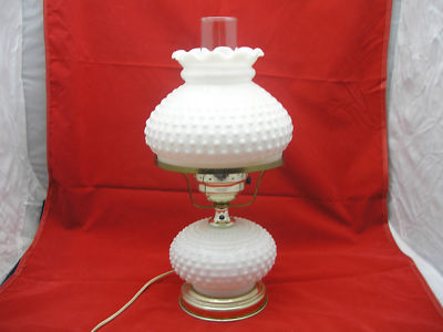 Vtg GWTW White Milk Glass Hobnail Hurricane Table Lamp