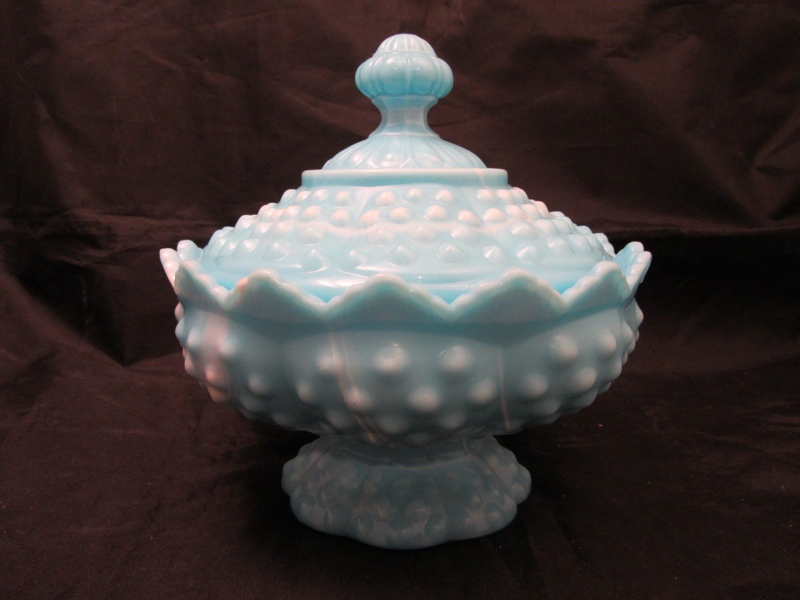 Title (ebay affiliate link): Vintage BLUE Fenton Milk Glass Hobnail Ruffled COVERED CANDY DISH