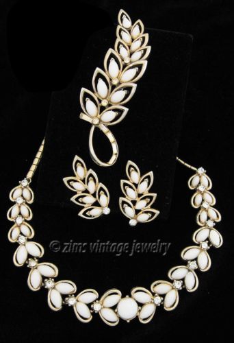 Title (ebay affiliate link): Vintage WHITE Milk glass FLORAL rhinestone NECKLACE Pin Earrings set Trifari ?