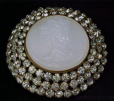 2 1/4" WIDE GILT & MILK GLASS RHINESTONE CAMEO PIN NR
