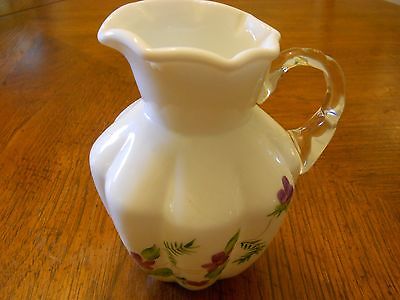 Title (ebay affiliate link): Fenton (?) Milk Glass w/Clear Handle Handpainted 5 3/4" Tall Pitcher
