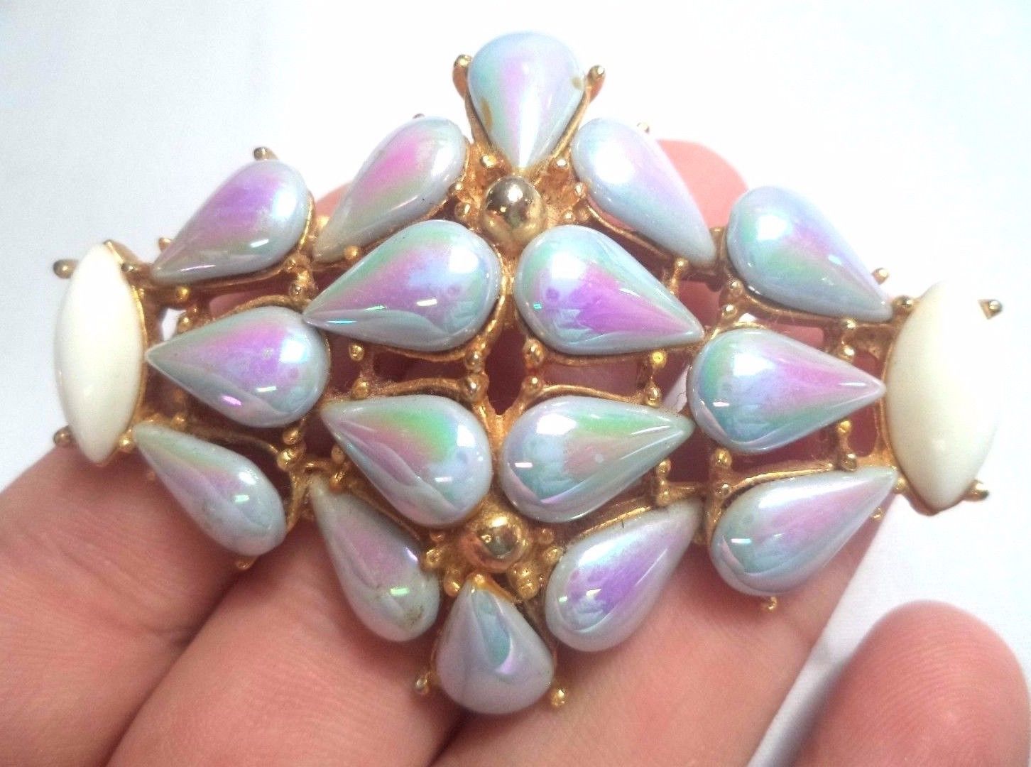 Title (ebay affiliate link): STUNNING VINTAGE HIGH END IRIDESCENT MILK GLASS FLOWER 2 5/8" BROOCH!!! G5604