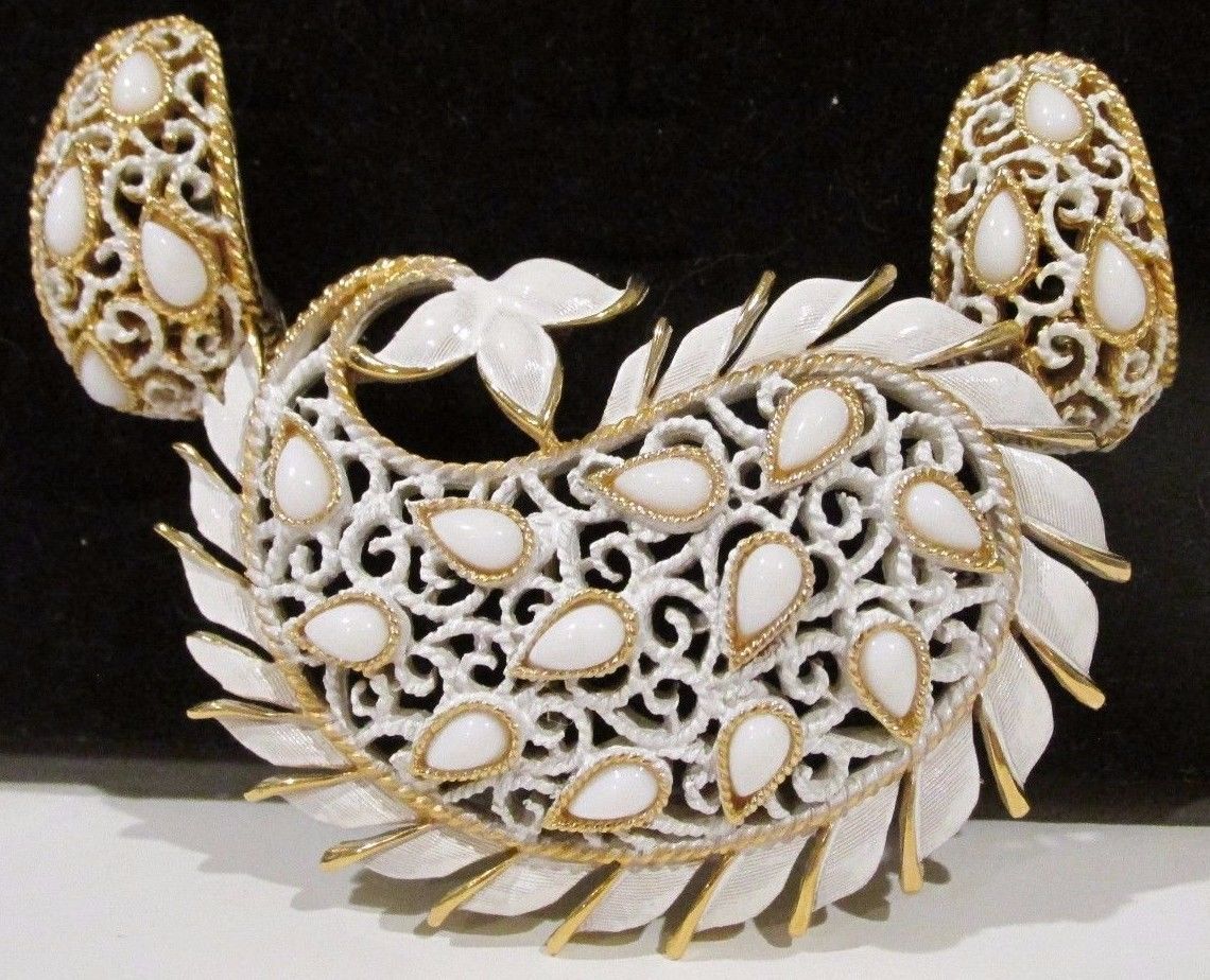 Title (ebay affiliate link): VINTAGE ESTATE CROWN TRIFARI SINGED Milk Glass Paisley Brooch & clip Earring SET