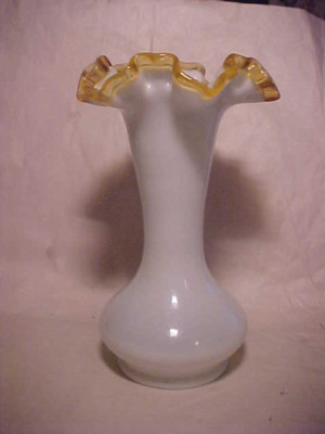 VINTAGE FENTON MILK GLASS GOLD AMBER CREST 8" TALL VASE