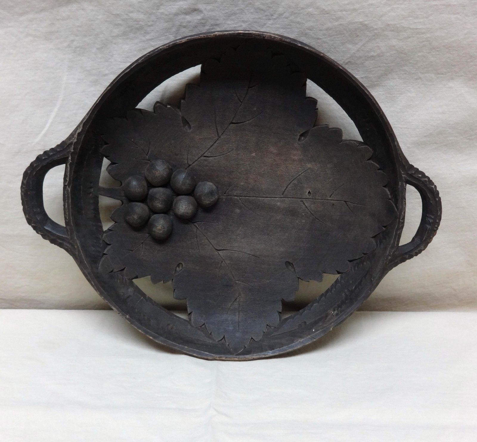 Title (ebay affiliate link): old wooden Carved wall hanging - Maple Leaf and grapes? in tray form 6 1/2" dia.