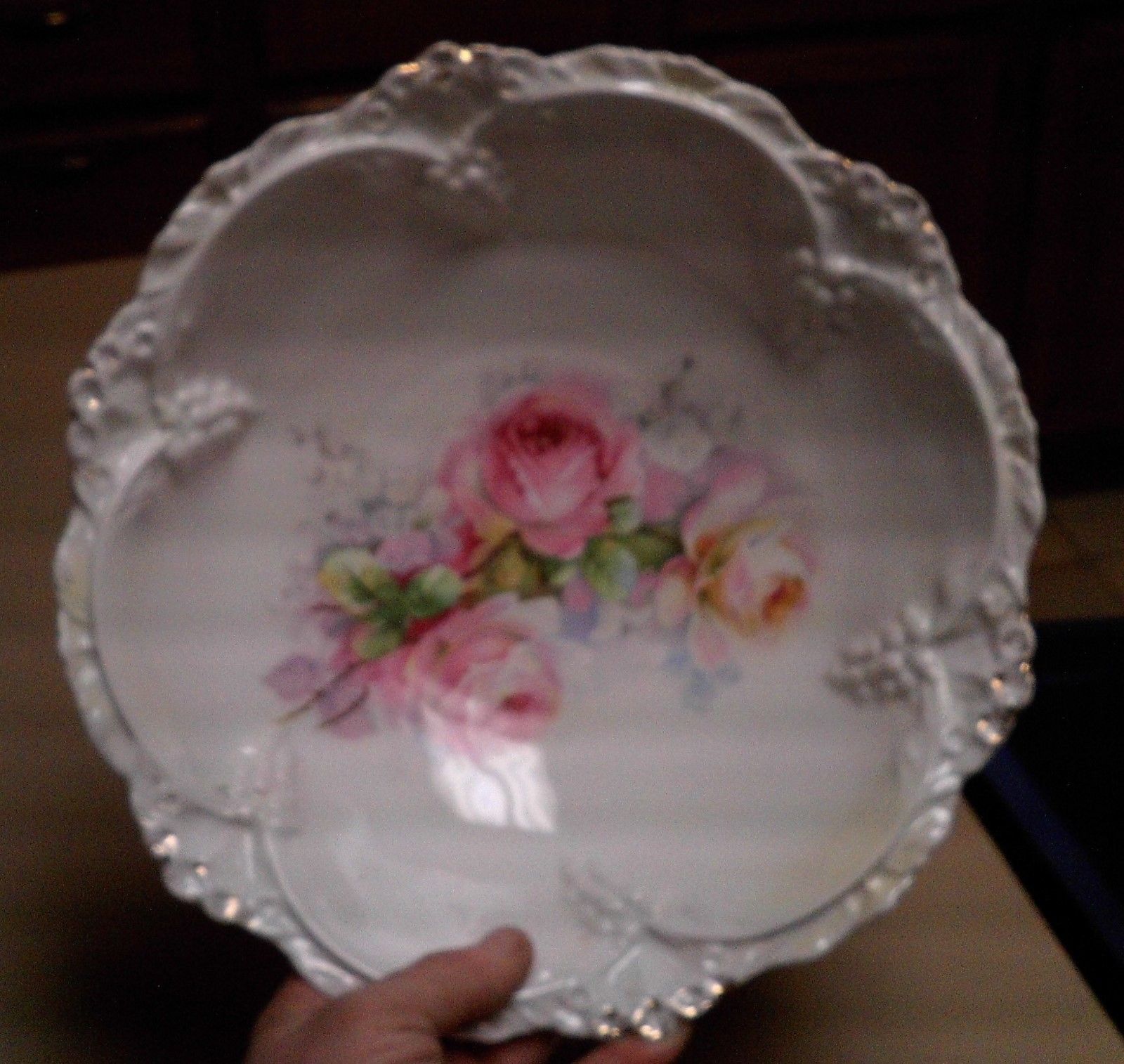 ANTIQUE BOWL GERMANY 823 HUGE PORCELAIN BOWL RAISED GRAPES & VINE PAINTED ROSES