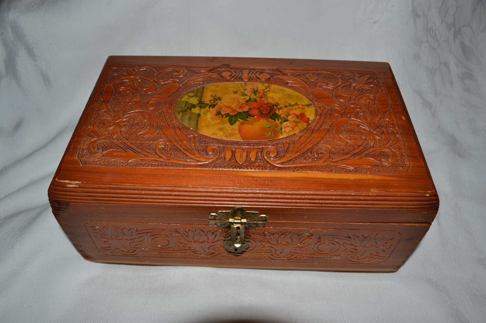 Title (ebay affiliate link): Vintage Carved Wood Jewelry Dresser Box Chest Flowers Lid Mirror Inside