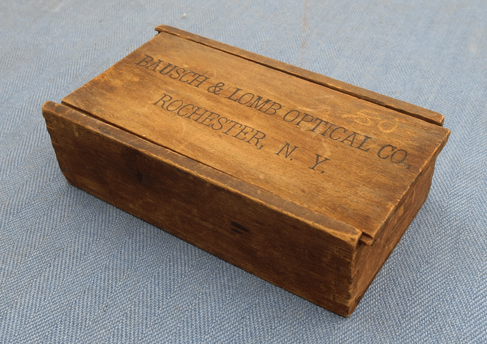 BAUSCH & LOMB OPTICAL CO. SMALL WOODEN DOVE TAIL BOX w/ SLIDING LID