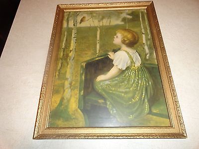 Antique Gold Wood Frame 16 x 12 Lovely old print girl bird print