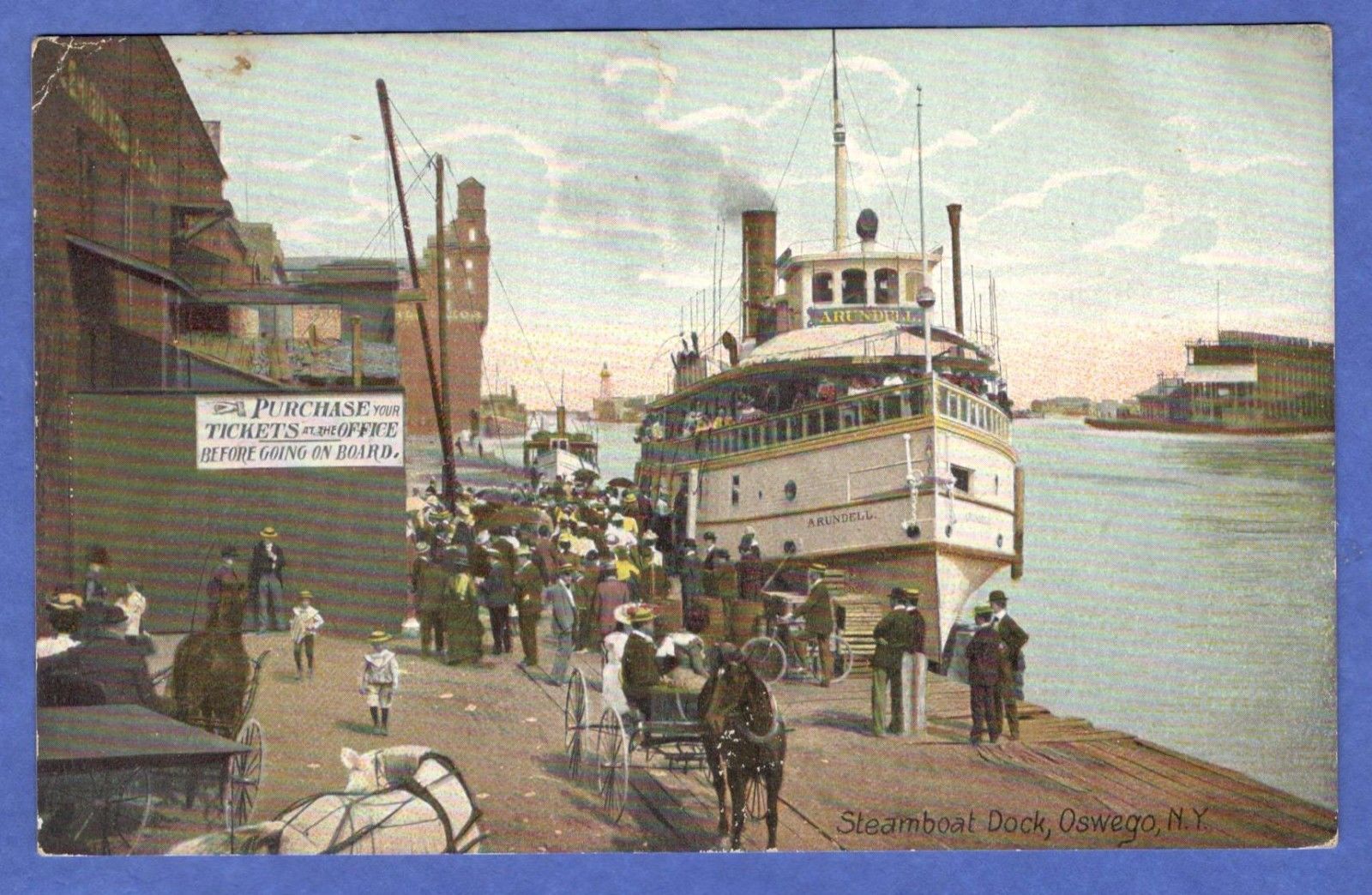 Title (ebay affiliate link): Oswego, NY, Steamboat Dock, Steamer Arundell, People Horse & Buggy Postcard 1907