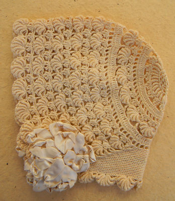 Antique Ecru Crochet Filet DOLL BONNET Silk Rosettes
