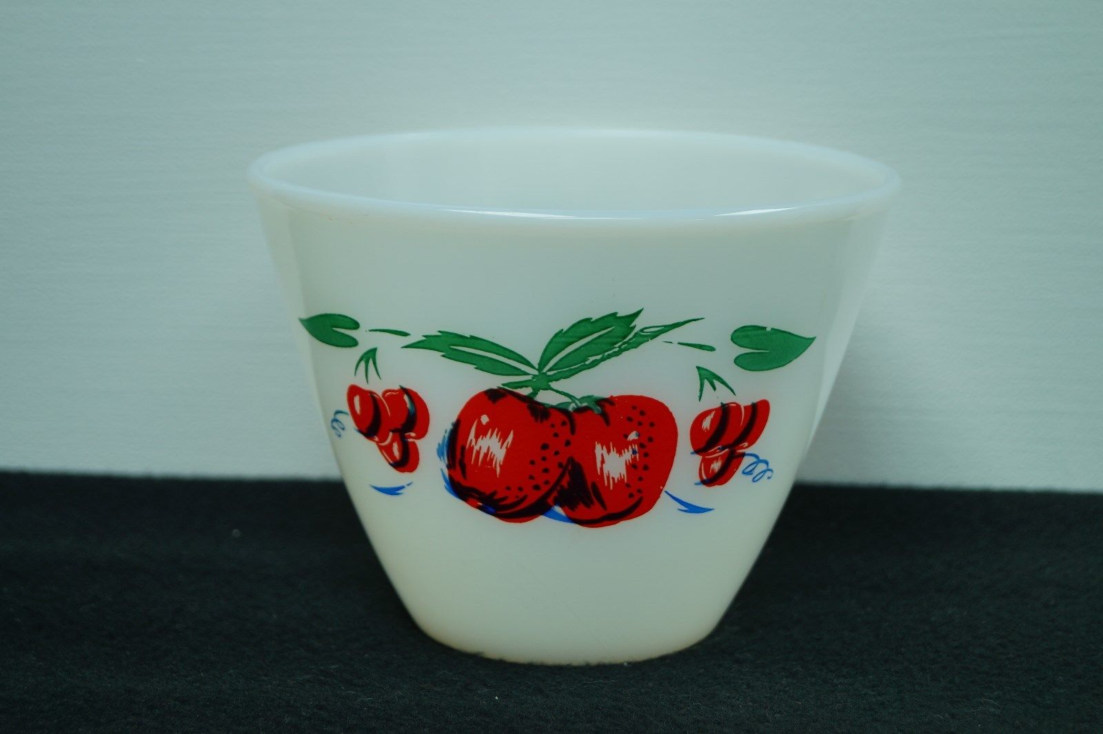 Title (ebay affiliate link): Fire King Milk Glass Apples and Cherries Mixing Bowl # 6, 4" high