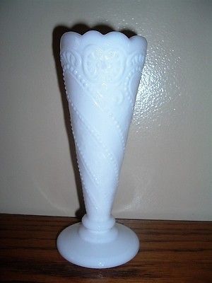 Title (ebay affiliate link): L.E. SMITH BEADS STARS & SCROLL 6-1/4" MILK GLASS TRUMPET VASE