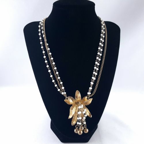 Vintage 24" Triple Strand Necklace White Milk Glass Bead Flower Leaf Tassel Y172