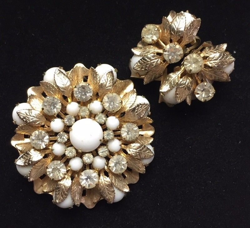 Title (ebay affiliate link): Vintage Brooch Pin Earrings Set White Milk Glass Rhinestone Flower Gold tone
