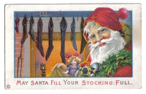 Title (ebay affiliate link): Santa Claus w/ Red Ball on Hat Stuffing Stockings on Mantle~Christmas Postcard