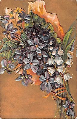 Title (ebay affiliate link): Bouquet of Lovely Violets & Lily of Valley Wrapped in Colored Leaf-Old Postcard