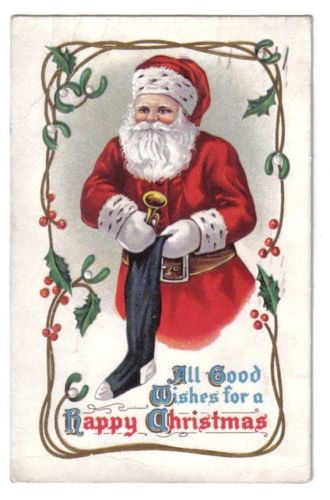 Title (ebay affiliate link): Santa Claus Stuffing Stocking w/ Horn~Series 314 E~Christmas Postcard~1924