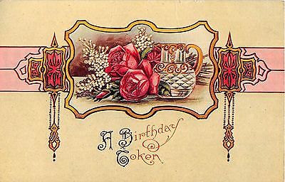 1912 Art Nouveau Birthday Postcard with Pretty Red Roses - No. 353