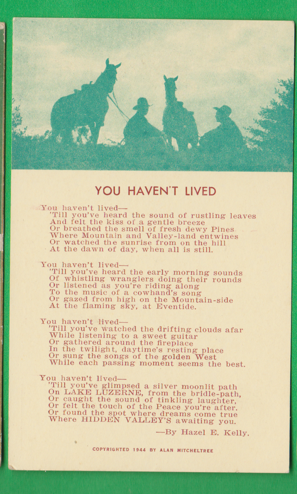 Lake Luzerne, NY/ Hidden Valley Dude Ranch/"You haven''t Lived"/ poem/ postcard