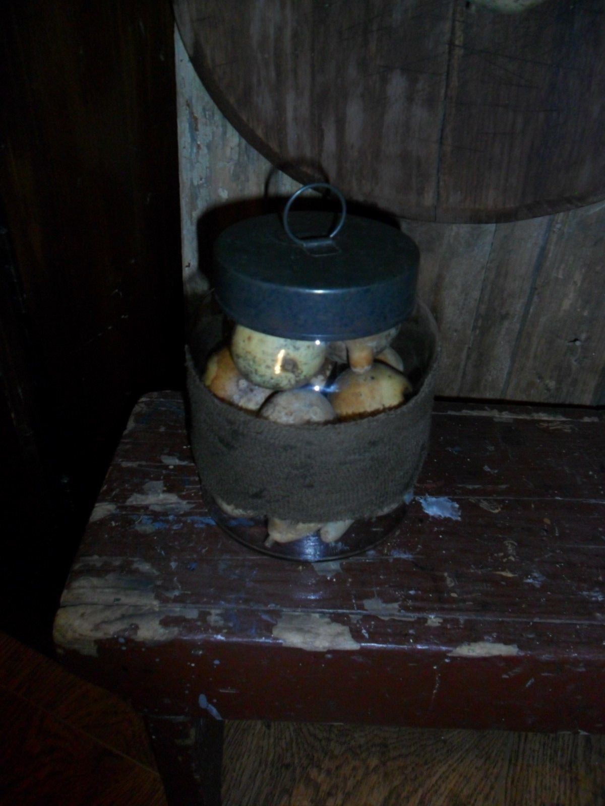 Primitive Pantry Jar filled w/ Tiny Dried Gourds, Dark Metal Lid & Cheesecloth