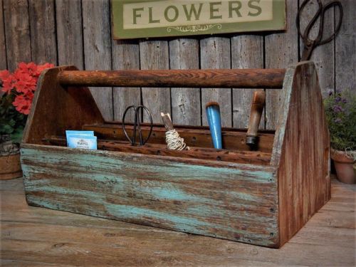 Title (ebay affiliate link): Vintage Old Rustic Wooden Carpenter Tool Box Primitive Tote Garden lots Cubbies