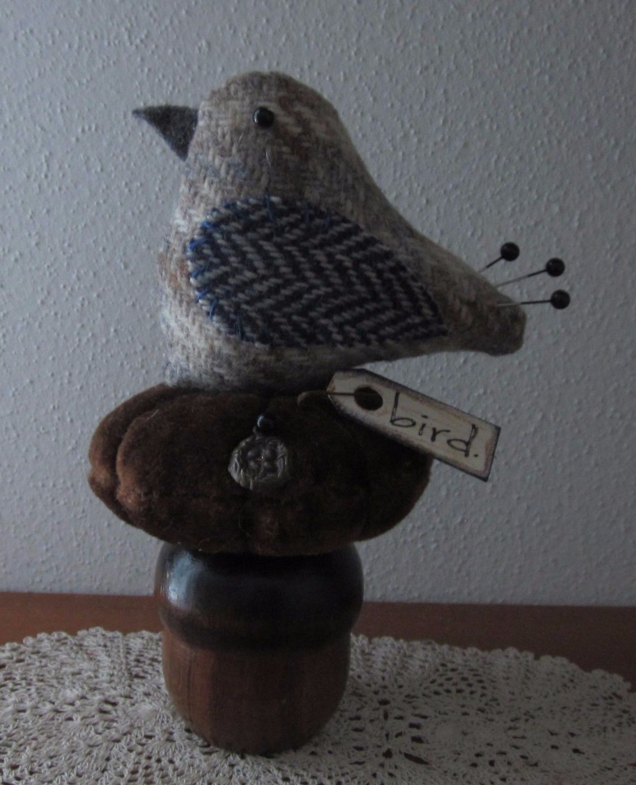 Title (ebay affiliate link): PRIMITIVE WOOL BIRD PEDESTAL NEST CHARM MAKE DO PIN CUSHION PFATT