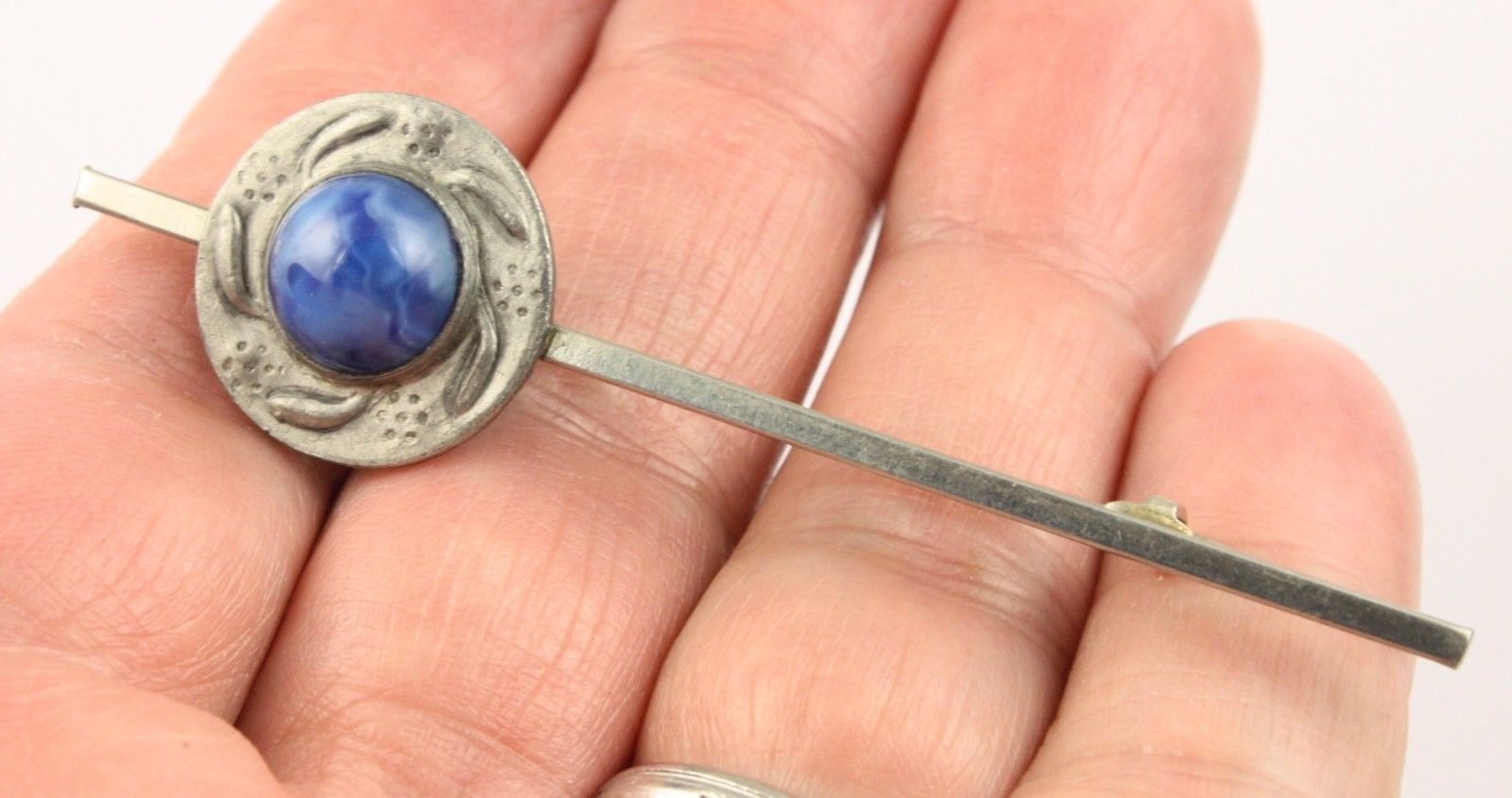 Title (ebay affiliate link): Antique Art Nouveau pewter c 1915 Ruskin style blue glass cabochon brooch pin