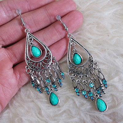 Title (ebay affiliate link): Vintage Womens Boho Antique-Silver Color Blue Rheinstones Dangle Hook Earrings