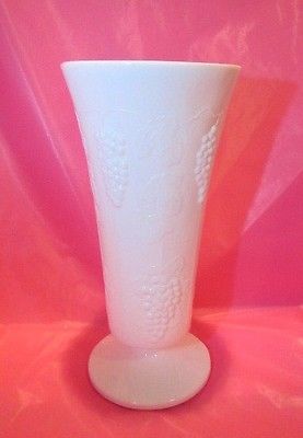 Title (ebay affiliate link): Vintage White Milk Glass Flower Vase with Grape Leaf Design 10 inches tall