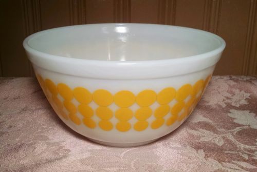 Title (ebay affiliate link): Vintage Pyrex Milk Glass Yellow Polka Dot Mixing Bowl 402, 1 1/2 Qt.