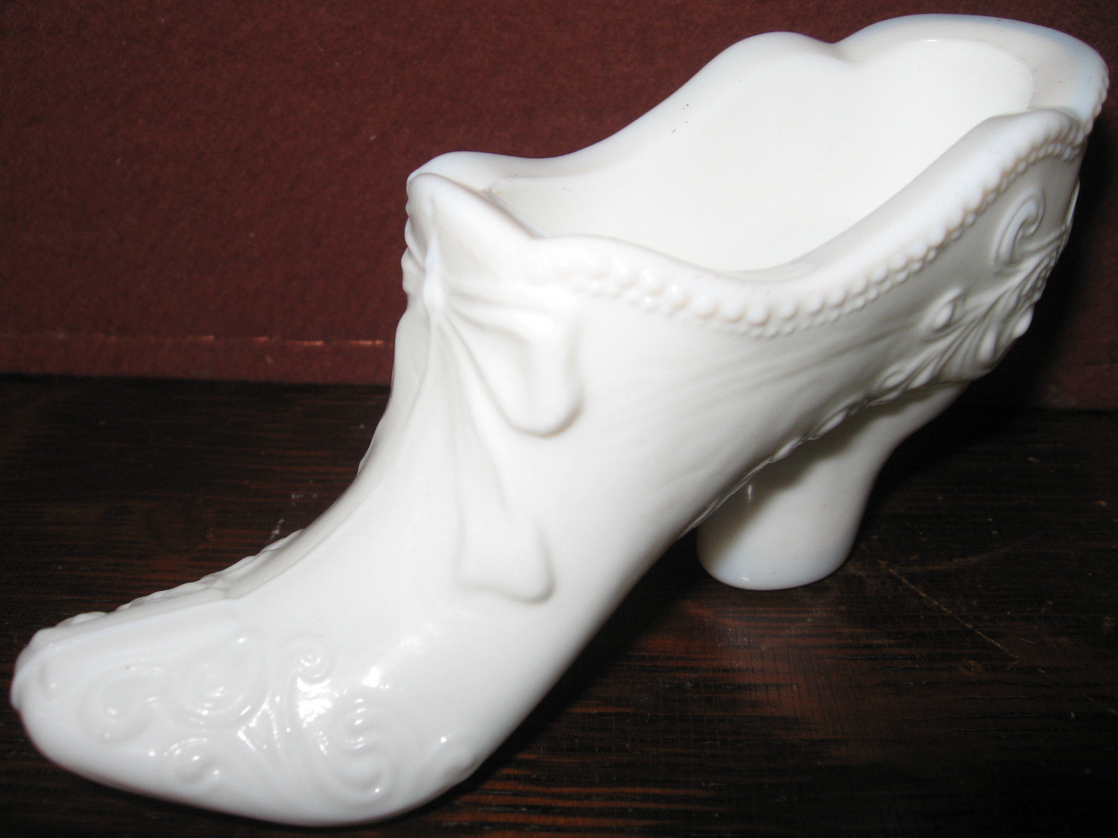 White Milk glass Bow pattern Shoe Slipper Boot christmas Opaque art high heel 5"