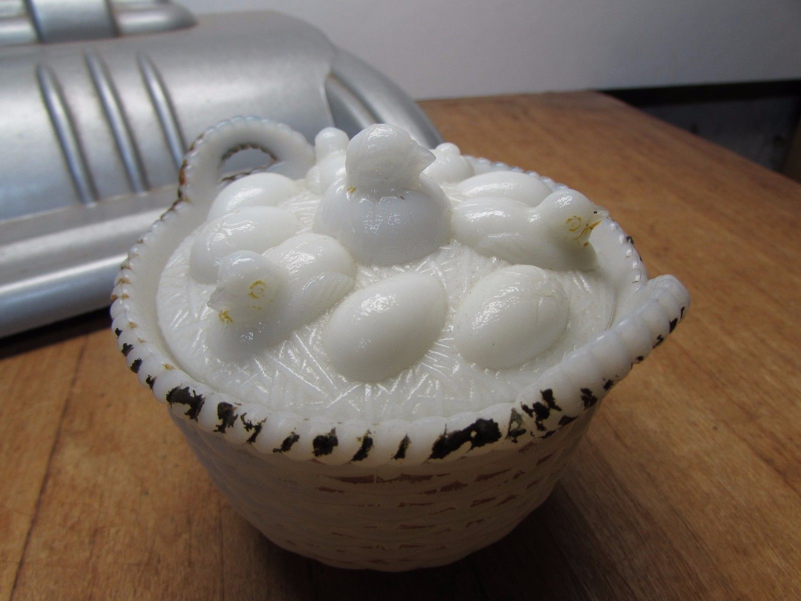 VINTAGE WESTMORELAND GLASS HATCHING CHICKS IN BASKET MILK GLASS COVERED JAR