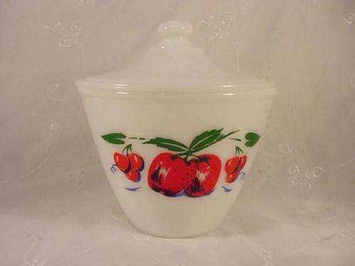 Vtg Anchor Hocking Fire King Milk Glass Grease Jar-Apples/Cherries