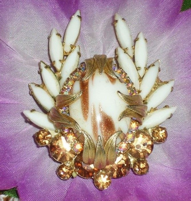 Vtg Brooch & Earring Set~Milk Glass~Aurora Borealis~Gold Rhinestones~Stunning