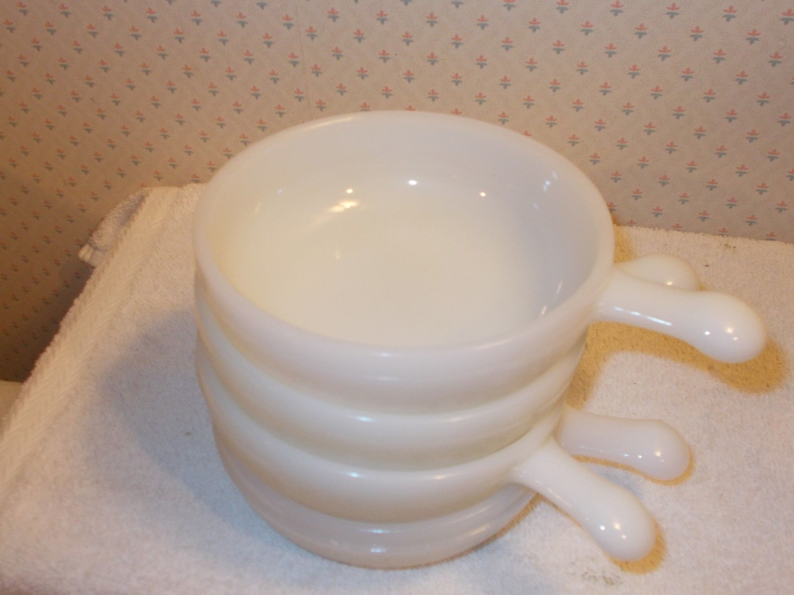 Title (ebay affiliate link): Set of 4 Retro White Milkglass Glasbake J2663 Soup Chili Bowls with Lug Handle