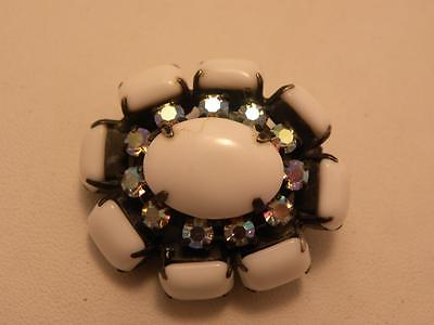VINTAGE MILKGLASS & AB RHINESTONE JAPANNED BROOCH