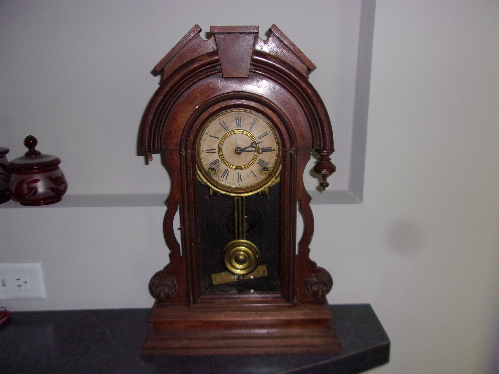 Title (ebay affiliate link): Antique Wood ANSONIA Mantel CLOCK, Lion Heads