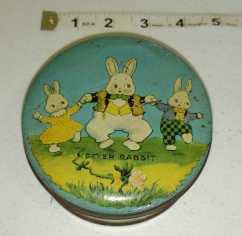 Title (ebay affiliate link): Vintage TINDECO Peter Rabbit Tin Litho Round Lidded Candy Tin 4" x 2"