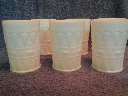 Title (ebay affiliate link): Vintage Kemple Lace & Dewdrops Set of 6 Milk Glass Tumblers 4"
