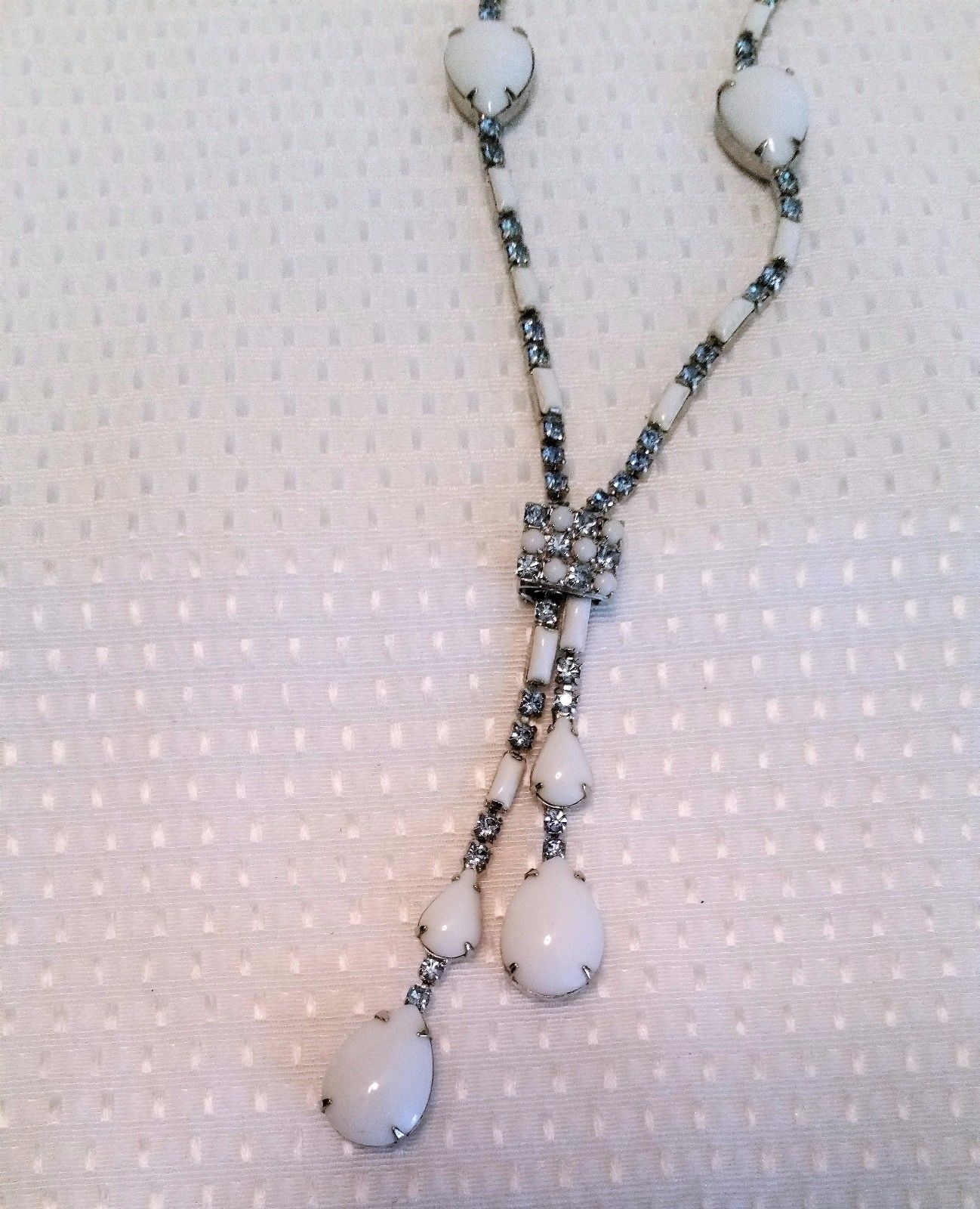 Title (ebay affiliate link): Vintage blue rhinestone white milk glass bolo lariat necklace unsigned designer